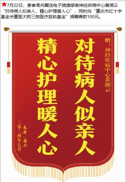 患者蒋兵赠送电子锦旗感谢神经疾病中心黄湘云,并向医疗救助基金捐赠善款100元。-锦旗-患者心声-患者服务-重庆医科大学附属第三医院【官方网站】