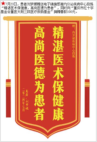 患者刘梦媛赠送电子锦旗感谢内分泌疾病中心段炼,并向医疗救助基金捐赠善款100元。-锦旗-患者心声-患者服务-重庆医科大学附属第三医院【官方网站】
