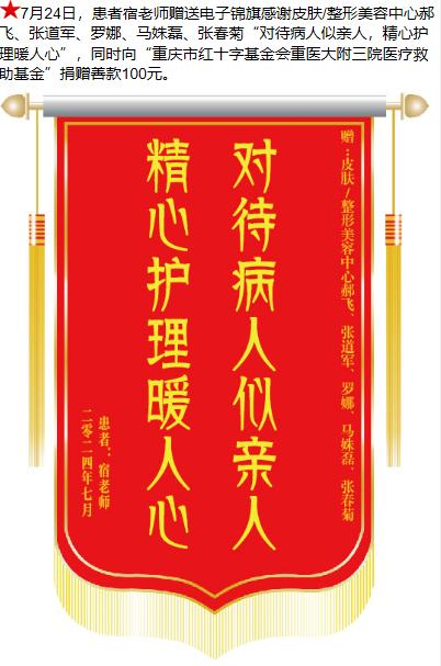 患者宿老师赠送电子锦旗感谢皮肤/整形美容中心郝飞等人,并向医疗救助基金捐赠善款100元。-锦旗-患者心声-患者服务-重庆医科大学附属第三医院【官方网站】