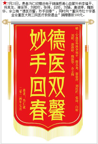 患者冯仁欣赠送电子锦旗感谢心血管外科李福平等人,并向医疗救助基金捐赠善款100元。-锦旗-患者心声-患者服务-重庆医科大学附属第三医院【官方网站】