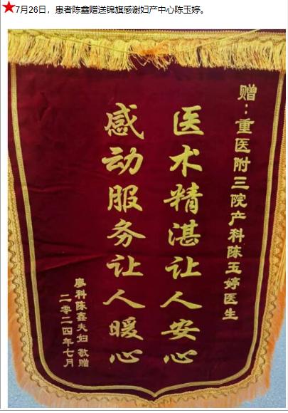患者陈鑫赠送锦旗感谢妇产中心陈玉婷。-锦旗-患者心声-患者服务-重庆医科大学附属第三医院【官方网站】