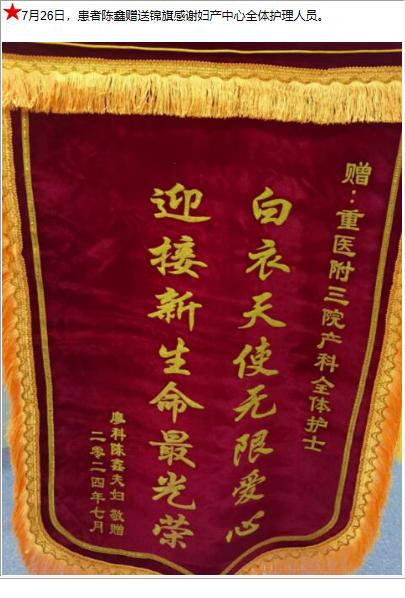 患者陈鑫赠送锦旗感谢妇产中心全体护理人员。-锦旗-患者心声-患者服务-重庆医科大学附属第三医院【官方网站】