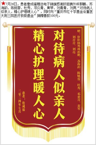 患者詹成福赠送电子锦旗感谢肝胆胰外科郭鹏等人,并向医疗救助基金捐赠善款100元。-锦旗-患者心声-患者服务-重庆医科大学附属第三医院【官方网站】