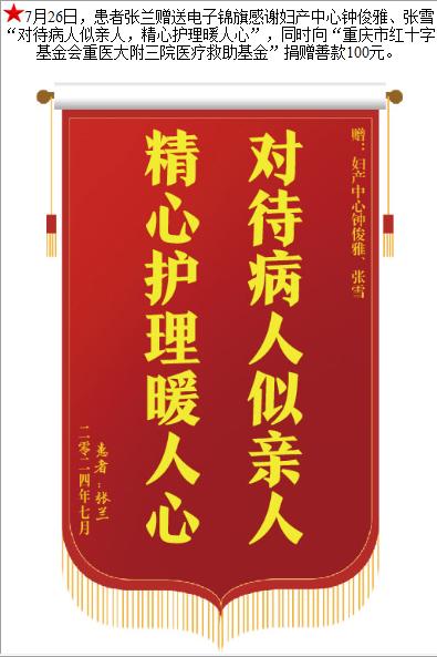患者张兰赠送电子锦旗感谢妇产中心钟俊雅等人,并向医疗救助基金捐赠善款100元。-锦旗-患者心声-患者服务-重庆医科大学附属第三医院【官方网站】