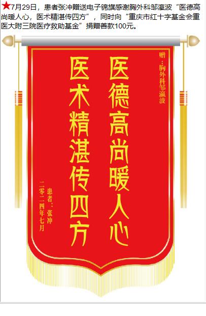患者张冲赠送电子锦旗感谢胸外科邹瀛波,并向医疗救助基金捐赠善款100元。-锦旗-患者心声-患者服务-重庆医科大学附属第三医院【官方网站】