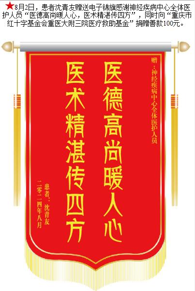 患者沈青友赠送电子锦旗感谢神经疾病中心全体医护人员,并向医疗救助基金捐赠善款100元。-锦旗-患者心声-患者服务-重庆医科大学附属第三医院【官方网站】
