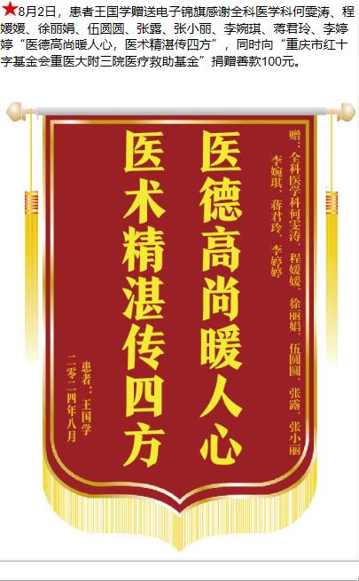患者王国学赠送电子锦旗感谢全科医学科何雯涛等人,并向医疗救助基金捐赠善款100元。-锦旗-患者心声-患者服务-重庆医科大学附属第三医院【官方网站】