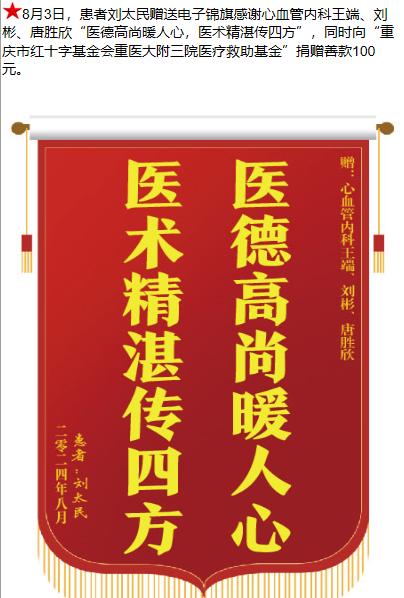 患者刘太民赠送电子锦旗感谢心血管内科王端等人,并向医疗救助基金捐赠善款100元。-锦旗-患者心声-患者服务-重庆医科大学附属第三医院【官方网站】