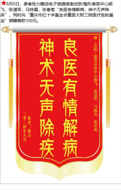 患者张力赠送电子锦旗感谢皮肤/整形美容中心郝飞等人,并向医疗救助基金捐赠善款100元。-锦旗-患者心声-患者服务-重庆医科大学附属第三医院【官方网站】