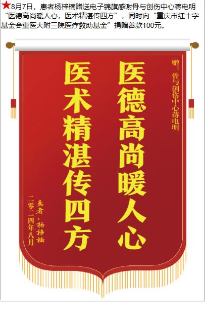 患者杨梓楠赠送电子锦旗感谢骨与创伤中心蒋电明,并向医疗救助基金捐赠善款100元。-锦旗-患者心声-患者服务-重庆医科大学附属第三医院【官方网站】