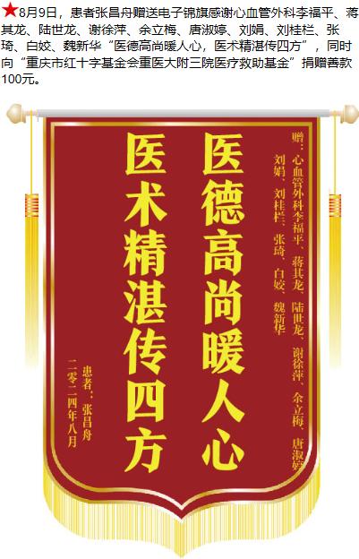 患者张昌舟赠送电子锦旗感谢心血管外科李福平等人,并向医疗救助基金捐赠善款100元。-锦旗-患者心声-患者服务-重庆医科大学附属第三医院【官方网站】
