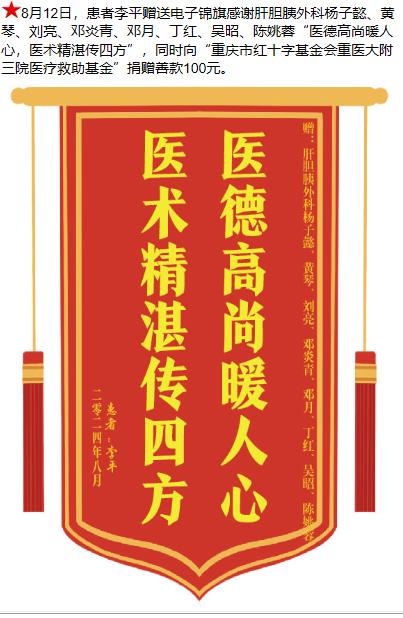 患者李平赠送电子锦旗感谢肝胆胰外科杨子懿等人,并向医疗救助基金捐赠善款100元。-锦旗-患者心声-患者服务-重庆医科大学附属第三医院【官方网站】