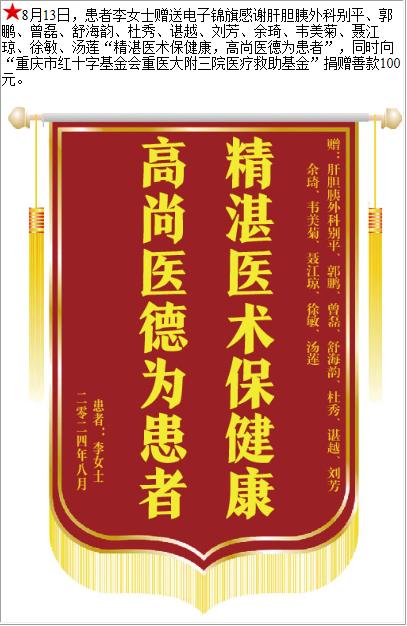 患者李女士赠送电子锦旗感谢肝胆胰外科别平等人,并向医疗救助基金捐赠善款100元。-锦旗-患者心声-患者服务-重庆医科大学附属第三医院【官方网站】