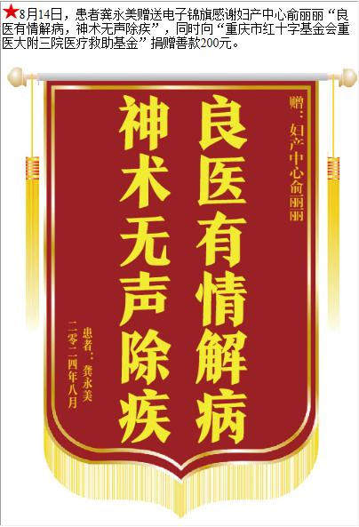 患者龚永美赠送电子锦旗感谢妇产中心俞丽丽,并向医疗救助基金捐赠善款200元。-锦旗-患者心声-患者服务-重庆医科大学附属第三医院【官方网站】