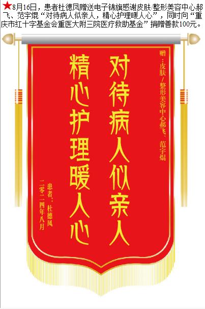 患者杜德凤赠送电子锦旗感谢皮肤/整形美容中心郝飞等人,并向医疗救助基金捐赠善款100元。-锦旗-患者心声-患者服务-重庆医科大学附属第三医院【官方网站】