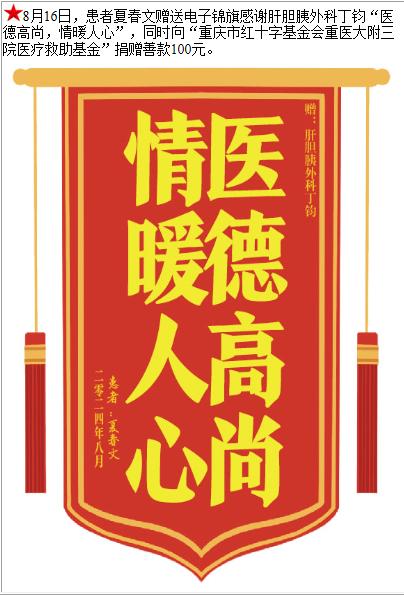 患者夏春文赠送电子锦旗感谢肝胆胰外科丁钧,并向医疗救助基金捐赠善款100元。-锦旗-患者心声-患者服务-重庆医科大学附属第三医院【官方网站】
