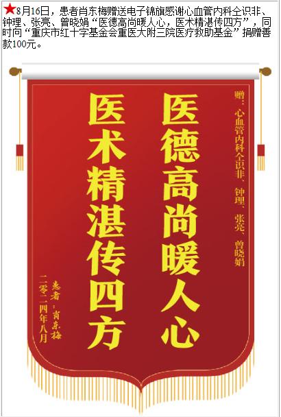 患者肖东梅赠送电子锦旗感谢心血管内科仝识非等人,并向医疗救助基金捐赠善款100元。-锦旗-患者心声-患者服务-重庆医科大学附属第三医院【官方网站】