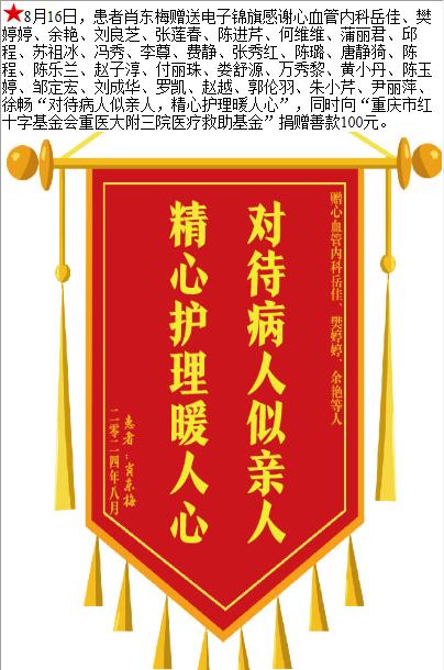 患者肖东梅赠送电子锦旗感谢心血管内科岳佳等人,并向医疗救助基金捐赠善款100元。-锦旗-患者心声-患者服务-重庆医科大学附属第三医院【官方网站】