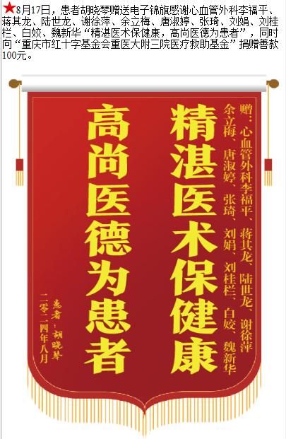 患者胡晓琴赠送电子锦旗感谢心血管外科李福平等人,并向医疗救助基金捐赠善款100元。-锦旗-患者心声-患者服务-重庆医科大学附属第三医院【官方网站】