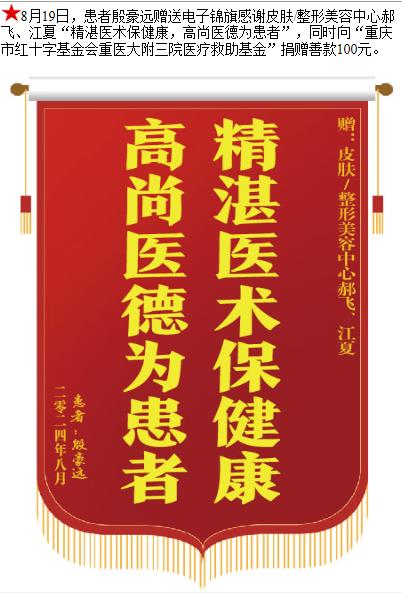 患者殷豪远赠送电子锦旗感谢皮肤/整形美容中心郝飞等人,并向医疗救助基金捐赠善款100元。-锦旗-患者心声-患者服务-重庆医科大学附属第三医院【官方网站】