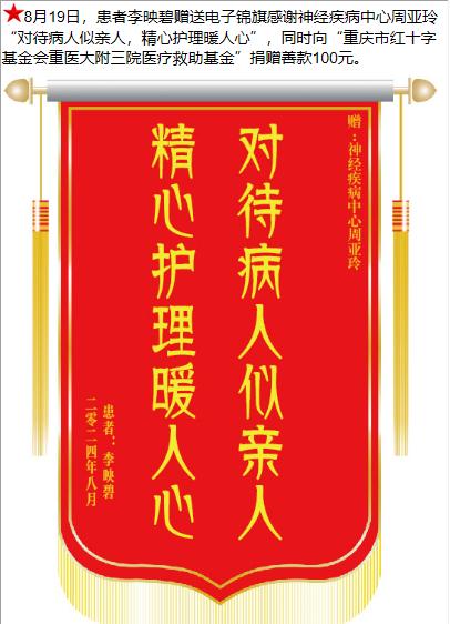 患者李映碧赠送电子锦旗感谢神经疾病中心周亚玲,并向医疗救助基金捐赠善款100元。-锦旗-患者心声-患者服务-重庆医科大学附属第三医院【官方网站】