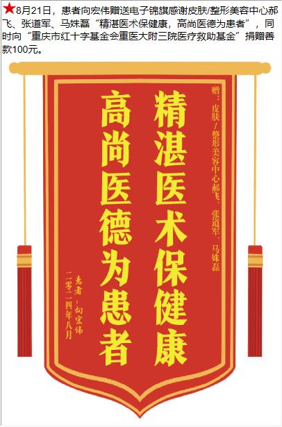 患者向宏伟赠送电子锦旗感谢皮肤/整形美容中心郝飞等人,并向医疗救助基金捐赠善款100元。-锦旗-患者心声-患者服务-重庆医科大学附属第三医院【官方网站】
