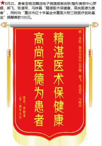 患者李晓龙赠送电子锦旗感谢皮肤/整形美容中心罗娜等人,并向医疗救助基金捐赠善款100元。-锦旗-患者心声-患者服务-重庆医科大学附属第三医院【官方网站】