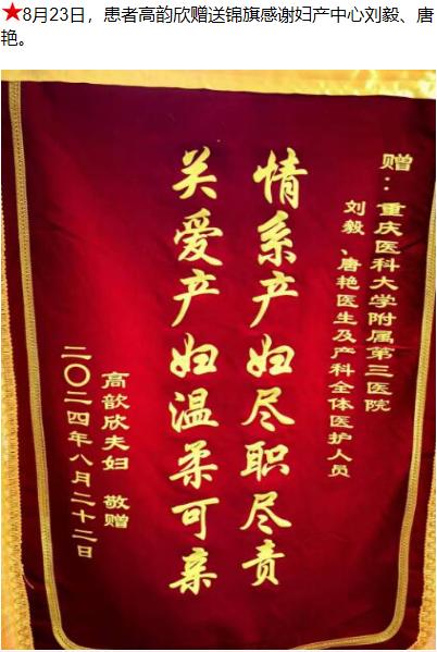 患者高韵欣赠送锦旗感谢妇产中心刘毅等人。-锦旗-患者心声-患者服务-重庆医科大学附属第三医院【官方网站】