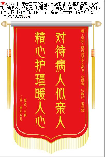 患者王爽赠送电子锦旗感谢皮肤/整形美容中心郝飞等人,并向医疗救助基金捐赠善款100元。-锦旗-患者心声-患者服务-重庆医科大学附属第三医院【官方网站】