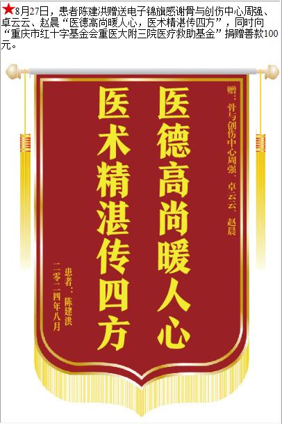 患者陈建洪赠送电子锦旗感谢骨与创伤中心周强等人,并向医疗救助基金捐赠善款100元。-锦旗-患者心声-患者服务-重庆医科大学附属第三医院【官方网站】