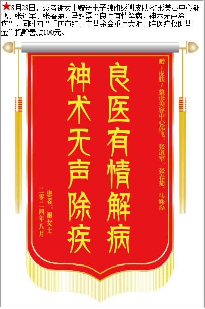 患者谢女士赠送电子锦旗感谢皮肤/整形美容中心郝飞等人,并向医疗救助基金捐赠善款100元。-锦旗-患者心声-患者服务-重庆医科大学附属第三医院【官方网站】