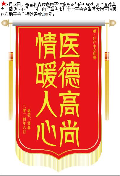 患者郭森赠送电子锦旗感谢妇产中心胡珊,并向医疗救助基金捐赠善款100元。-锦旗-患者心声-患者服务-重庆医科大学附属第三医院【官方网站】