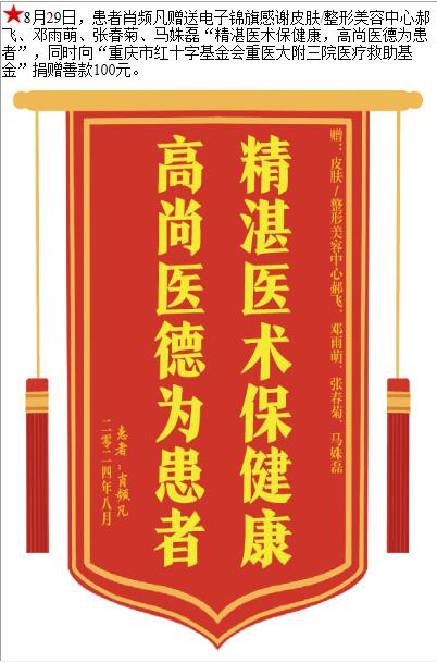 患者肖频凡赠送电子锦旗感谢皮肤/整形美容中心郝飞等人,并向医疗救助基金捐赠善款100元。-锦旗-患者心声-患者服务-重庆医科大学附属第三医院【官方网站】