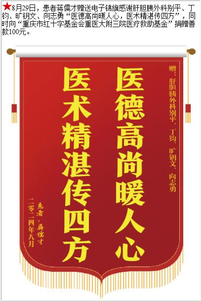 患者蒋儒才赠送电子锦旗感谢肝胆胰外科别平等人,并向医疗救助基金捐赠善款100元。-锦旗-患者心声-患者服务-重庆医科大学附属第三医院【官方网站】
