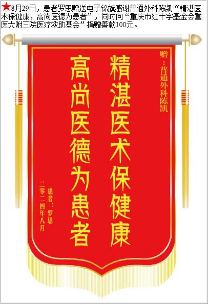 患者罗思赠送电子锦旗感谢普通外科陈凯,并向医疗救助基金捐赠善款100元。-锦旗-患者心声-患者服务-重庆医科大学附属第三医院【官方网站】