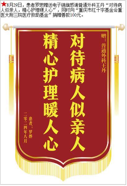 患者罗思赠送电子锦旗感谢普通外科王丹,并向医疗救助基金捐赠善款100元。-锦旗-患者心声-患者服务-重庆医科大学附属第三医院【官方网站】