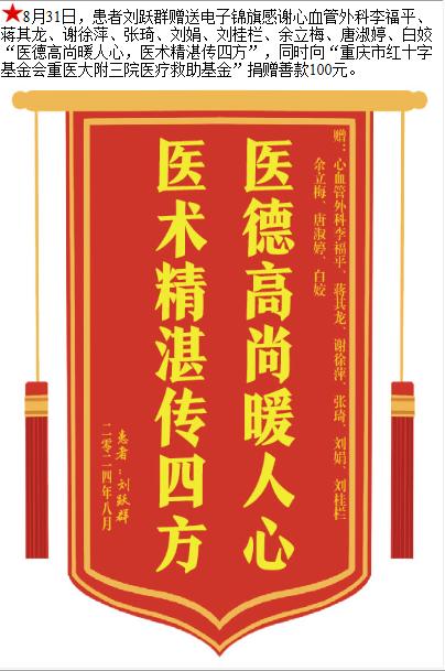 患者刘跃群赠送电子锦旗感谢心血管外科李福平等人,并向医疗救助基金捐赠善款100元。-锦旗-患者心声-患者服务-重庆医科大学附属第三医院【官方网站】