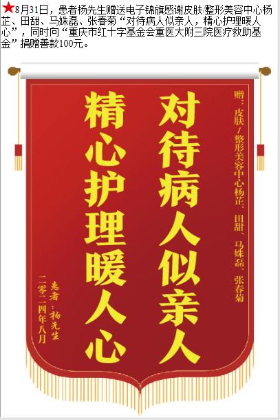 患者杨先生赠送电子锦旗感谢皮肤/整形美容中心杨芷等人,并向医疗救助基金捐赠善款100元。-锦旗-患者心声-患者服务-重庆医科大学附属第三医院【官方网站】