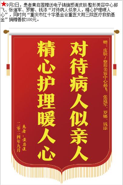 患者黄启莲赠送电子锦旗感谢皮肤/整形美容中心郝飞等人,并向医疗救助基金捐赠善款100元。-锦旗-患者心声-患者服务-重庆医科大学附属第三医院【官方网站】