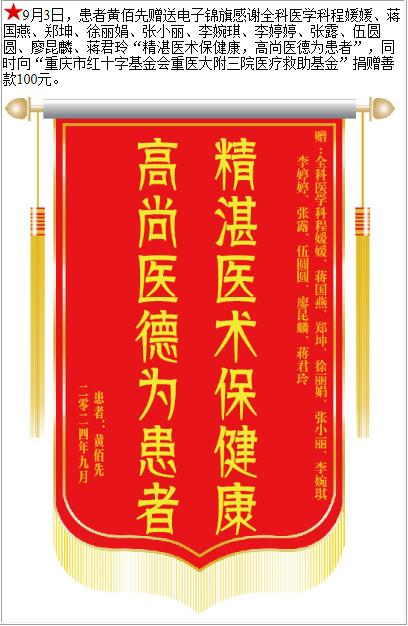患者黄佰先赠送电子锦旗感谢全科医学科程媛媛等人,并向医疗救助基金捐赠善款100元。-锦旗-患者心声-患者服务-重庆医科大学附属第三医院【官方网站】