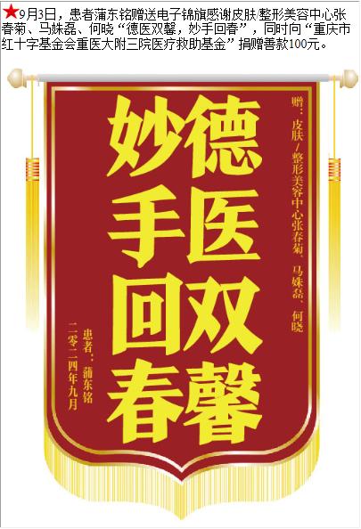 患者蒲东铭赠送电子锦旗感谢皮肤/整形美容中心张春菊等人,并向医疗救助基金捐赠善款100元。-锦旗-患者心声-患者服务-重庆医科大学附属第三医院【官方网站】