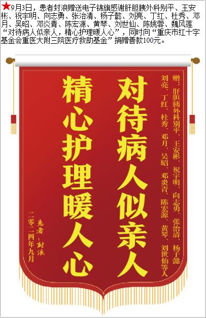 患者封浪赠送电子锦旗感谢肝胆胰外科别平等人,并向医疗救助基金捐赠善款100元。-锦旗-患者心声-患者服务-重庆医科大学附属第三医院【官方网站】