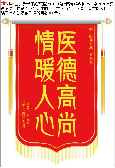 患者阳维军赠送电子锦旗感谢眼科谢琳等人,并向医疗救助基金捐赠善款100元。-锦旗-患者心声-患者服务-重庆医科大学附属第三医院【官方网站】