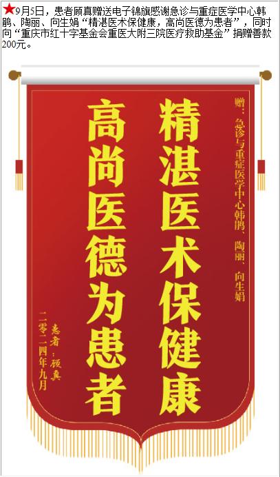 患者顾真赠送电子锦旗感谢急诊与重症医学中心韩鹃等人,并向医疗救助基金捐赠善款200元。-锦旗-患者心声-患者服务-重庆医科大学附属第三医院【官方网站】
