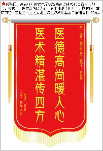 患者张汀赠送电子锦旗感谢皮肤/整形美容中心郝飞等人,并向医疗救助基金捐赠善款100元。-锦旗-患者心声-患者服务-重庆医科大学附属第三医院【官方网站】