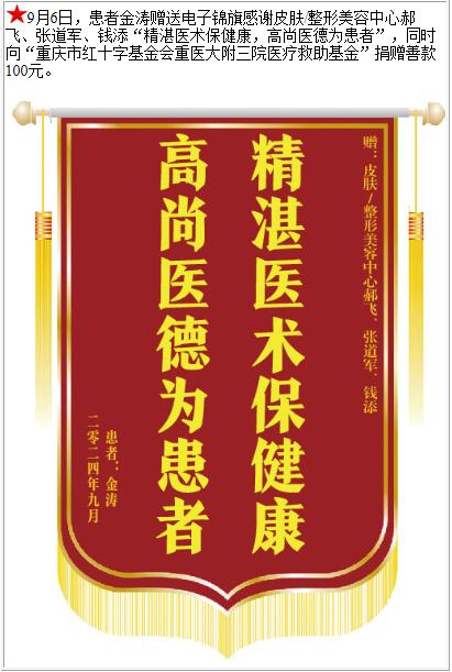 患者金涛赠送电子锦旗感谢皮肤/整形美容中心郝飞等人,并向医疗救助基金捐赠善款100元。-锦旗-患者心声-患者服务-重庆医科大学附属第三医院【官方网站】