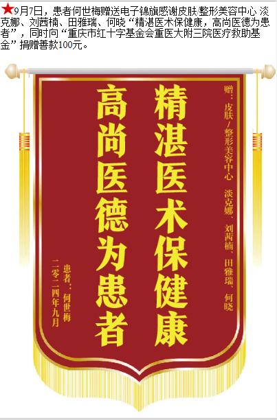 患者何世梅赠送电子锦旗感谢皮肤/整形美容中心淡克娜等人,并向医疗救助基金捐赠善款100元。-锦旗-患者心声-患者服务-重庆医科大学附属第三医院【官方网站】