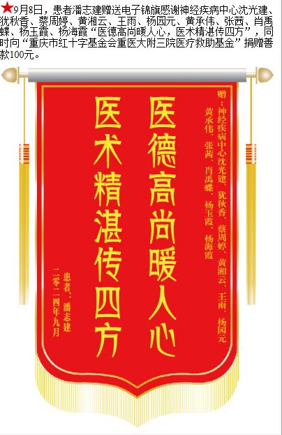 患者潘志建赠送电子锦旗感谢神经疾病中心沈光建等人,并向医疗救助基金捐赠善款100元。-锦旗-患者心声-患者服务-重庆医科大学附属第三医院【官方网站】