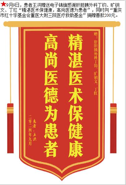 患者王洪赠送电子锦旗感谢肝胆胰外科丁钧等人,并向医疗救助基金捐赠善款200元。-锦旗-患者心声-患者服务-重庆医科大学附属第三医院【官方网站】