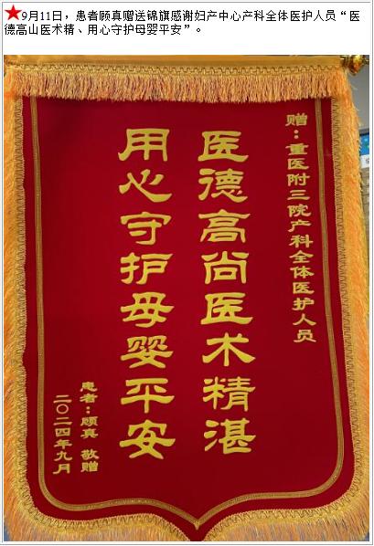 患者顾真赠送锦旗感谢妇产中心产科全体医护人员。-锦旗-患者心声-患者服务-重庆医科大学附属第三医院【官方网站】